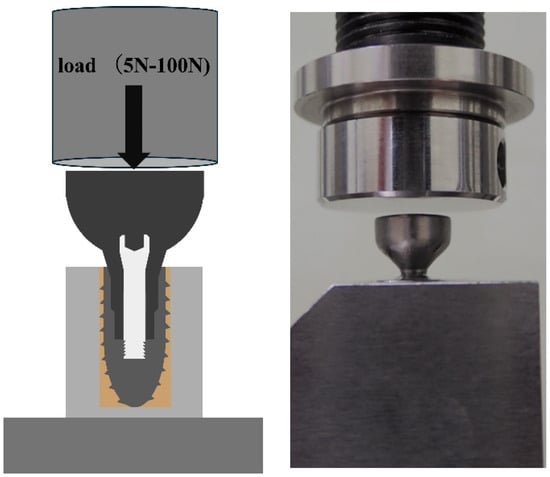 The Ti abutment was tightened to the implant with an original Ti abutment screw at the manufacturer’s specified torque of 35 Ncm and again at 35 Ncm 10 min after tightening, after which the specimen was used. The specimens were fixed with resin cement (Rilayex™ Unisem 2 Automix, 3M, St. Paul, MN, USA) to a special loading jig for implant dynamic fatigue testing according to ISO 14801 (Figure 2).