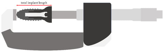 The total length of the implant–abutment assembly was measured after tightening to 5 N, 10 min after tightening to 35 N, and after the load test using an electronic digital micrometer (Digimatic Outside Micrometer, Mitutoyo, Kawasaki, Japan) (Figure 4).