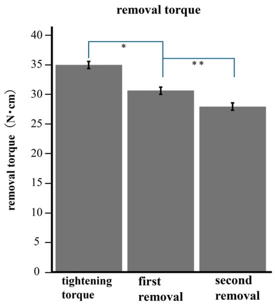 The removal torques before and after loading are summarized in Figure 5. The mean removal torque was 30.67 N after 10 min of tightening and 27.95 N after loading. After 200,000 cycles, the removal torque was significantly lower than the tightening torque after 10 min (p < 0.05).