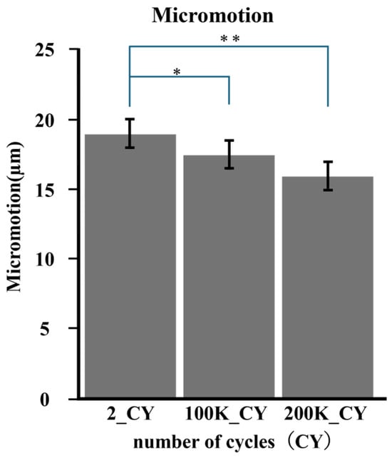 Micromotion tended to decrease with increasing load cycles, as shown in Figure 6. The mean of micromotion was 0.018 mm at 2 cycles, 0.016 mm at 100,000 cycles, and 0.0157 mm at 200,000 cycles. The micromotion of 100,000 cycles was significantly smaller than that of 2 cycles (p < 0.05), and that of 200,000 cycles was also smaller than that of 2 cycles (p < 0.05) (Figure 7).