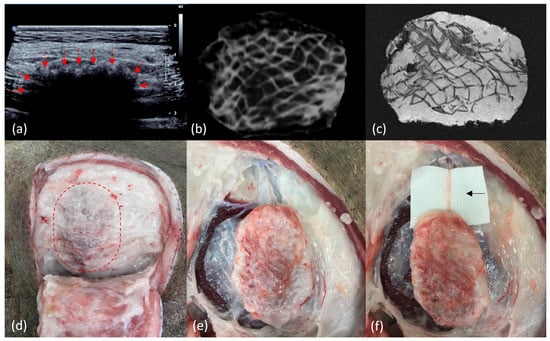 Radiological and macroscopic images of scaffolds at the 12-month end point. (a) Ultrasound of scaffold in situ, demonstrating tissue infiltration from host tissue into the scaffold marked by arrows. (b) Computed tomography of explanted scaffold demonstrating a hypodense signal of adipose tissue filling the scaffold structure, which has a hyperdense signal. (c) Magnetic resonance imaging with fat saturated (T1) sequence of explanted scaffold demonstrating the high signal of adipose tissue filling the scaffold structure, which has a low signal. (d) View of scaffold in situ (dotted line) with overlying soft tissue reflected back, demonstrating significant tissue integration and a lack of fibrous capsule formation. (e) View of scaffold partially dissected from surrounding tissue, demonstrating a lack of scaffold migration or rotation, significant tissue integration, and a lack of fibrous encapsulation. (f) View of completely dissected scaffold filled with soft tissue. There is an arrow showing a dissected blood vessel growing into the scaffold from a major blood vessel in the surrounding host tissue.