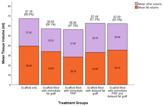 We were able to regenerate and sustain a mean soft tissue volume of 60.9 ± 4.5 mL (95% CI) at 12 months across all scaffolds. There was no statistically significant difference in the total volume of soft tissue sustained between treatment groups (Figure 4). Across all groups, the soft tissue was primarily composed of adipose tissue compared to other soft tissue types, with the highest proportion of adipose tissue regenerated in the scaffolds filled with the immediate fat graft group and the lowest in the scaffold filled with immediate PRP. In scaffolds filled with fat grafts, there was no statistical difference in the volume of soft tissue sustained compared to scaffolds not filled with fat grafts (60.46 ± 5.6 mL (95% CI), 61.62 ± 7.8 mL (95% CI), respectively, p > 0.05).