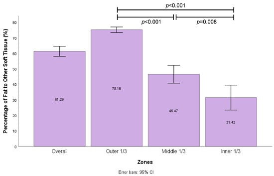 Proportion of fat per zone in each scaffold based on MRI analysis with error bars (n = 43 in each group). Significant statistical difference between outer 1/3, middle 1/3, and inner 1/3 zones on Welch’s ANOVA and Games–Howell’s post hoc test.
