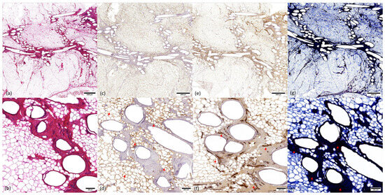 Histology and immunohistochemistry of explanted mPCL scaffolds at 12 months. (a) Hematoxylin and eosin (H&E) overview (0.7× zoom). Central arrangement of scaffold struts, adjacent rich extracellular matrix (ECM) network, and regenerated adipose tissue filling the scaffold pores. (b) H&E high magnification (5× zoom) showing arrangement of scaffold struts, ECM network, and adipocytes. (c) Overview (0.7× zoom) of Perilipin (PLN1) stain demonstrating viable adipocytes (arrows). (d) High magnification (5× zoom) view of PLN1 stain demonstrating viable adipocytes. (e) Overview (0.7× zoom) of von Willebrand (vWF) stain demonstrating vasculature in the rich ECM network surrounding mPCL struts and around regenerated adipocytes. (f) High-magnification (5× zoom) view of vWF stain demonstrating vascularity (arrows). (g) Overview (0.7× zoom) of Masson’s trichome stain demonstrates intense collagen staining in the ECM zone surrounding mPCL struts. There is no evidence of fibrous capsules at the periphery of the scaffold. (h) High-magnification (5× zoom) view of Masson’s trichrome stain showing ECM network around scaffold struts (arrows).