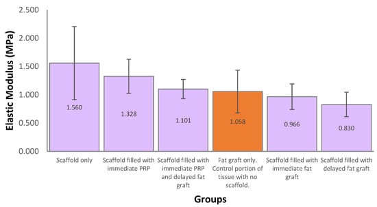 The mean elastic modulus for explanted scaffolds was 1.157 MPa, which was similar to a control portion of tissue excised at the fat-graft-only treatment site, which was 1.058 MPa (Figure 7).