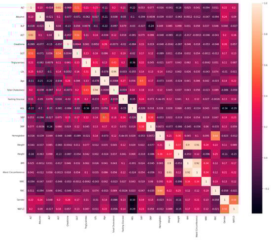 This study utilized the National Health and Nutrition Examination Survey (NHANES) dataset, administered by the Centers for Disease Control (CDC) of the United States []. The dataset comprises 2505 subjects. Our focus was on 23 specific relevant features that are crucial for NAFLD investigation. These features were meticulously selected based on their potential significance in improving our understanding of NAFLD. Notably, the selected features include laboratory tests levels of Total Cholesterol, Weight, Height, BMI, Waist Circumference, white blood cell count (WBC), red blood cell count (RBC), systolic blood pressure (SBP), diastolic blood pressure (DBP), Hemoglobin, albumin, alkaline phosphatase (ALP), aspartate aminotransferase (AST), alanine aminotransferase (ALT), γ-glutamyl transferase (GGT), Creatinine, Triglycerides, LDL, HDL, and Fasting Glucose. Furthermore, demographic variables comprising age and gender, alongside the presence of NAFLD were included.