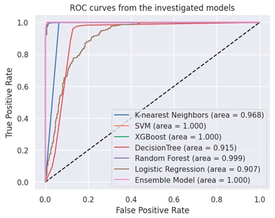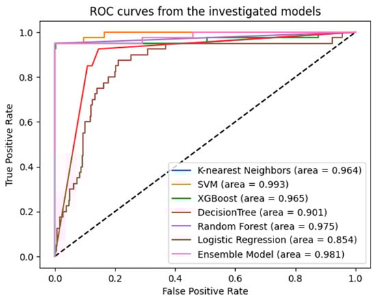 Figure 2 visually depicts AUC values and ROC curves acquired through employing the ensemble model and the machine learning algorithms. These metrics are crucial in assessing the performance and discrimination capabilities of the models. To compare the predicted values of the implemented techniques with the actual values, the confusion matrix was utilized. The confusion matrix, which outlines the true positives, true negatives, false positives, and false negatives, is detailed in Table 5. Additionally, MAE values for the testing and training datasets are provided in Table 6. These values are crucial indicators for assessing model performance and determining whether the model is overfitting to the training data. By comparing the MAE values, one can evaluate the generalization ability of the model.