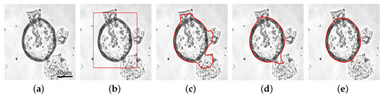 Figure 4 shows an example of the curve evolution process using our method. For this image, we made λ 1 = 3.5 . Figure 4b presents the initial contour automatically generated by manually selecting the center point (green point) of the organoid using the method mentioned above. Figure 4c,d show the shapes of the contour at 200 and 800 iterations, and Figure 4e is the final result. The difficulty in segmenting this image is making the contour overcome the impact of three parts of the impurities in the culture dish and shrink towards the organoid boundary with the convexity-preserving ability. We can see that our model has a strong convexity-preserving force so that it can pull the contour through those impurities and contract towards the organoid boundary, as shown in Figure 4c,d. On the other hand, the convexity-preserving ability also ensures that, when the contour shrinks to the vicinity of the boundary, it does not cross the boundary and enter the organoid’s interior, effectively avoiding boundary leakage.