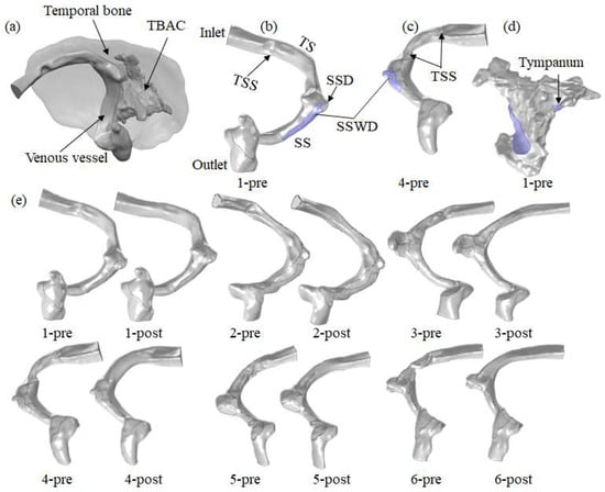 Geometry models. (a) Position of the temporal bone, venous vessel and TBAC. Taking patient 1–pre and patient 4–pre as examples: (b,c) position of the inlet, TS, TSS, SSD, SSWD, SS and outlet. (d) Position of the tympanum in TBAC. (e) Preoperative and postoperative venous vessel geometry models of each patient.