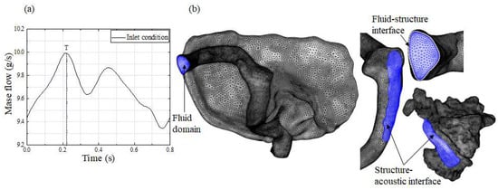 The fluid–structure and acoustic–structure interaction studies were solved using COMSOL Multiphysics software 5.6 (COMSOL AB, Stockholm, Sweden). The fully coupled method using the MUMPS direct solver was applied to solve the fluid–structure interaction problem. The maximum number of iterations was set as 50, and the automatic time step was chosen to meet the CFL criterion <1. The iterative convergence criteria were based on a threshold of residuals less than 10−3. The one-way coupled technique with the suggested direct solver from MUMPS was selected to solve the acoustic–structure interaction problem. The maximum iteration number was set as 25, and the convergence precision was set as less than 10−3.