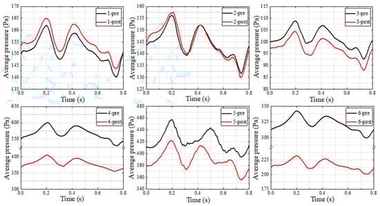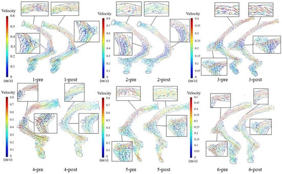 Figure 3 depicts the preoperative and postoperative velocity vector at the maximum velocity moment for each patient. The vortex formed at the TS–SS junction and SSD region. The blood flow velocity of the postoperative patients decreased at the TSS region compared with the preoperative patients. At the TS–SS junction region, the blood flow velocity of group 1 (patients 1 to 3) was similar to the preoperative state. Nevertheless, the blood flow velocity of group 2 (patients 4 to 6) was lower than the preoperative state.