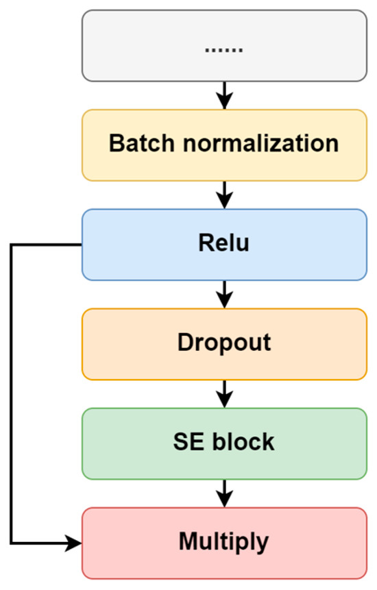 As the key component of atten-CCNN, the attention mechanism is employed to increase the network’s representation space by reweighting the contribution of different feature maps (filters) in each convolutional layer. Specifically, the SE block is used in this study. Owing to the lightweight structure, the SE block slightly increases the computational load and complexity of the original models. Moreover, the SE block has high compatibility and can be integrated into existing network architectures without major modifications. In terms of the connection between the SE attention with the convolutional layer, as shown in Figure 2, an adjusted connection scheme was designed rather than simply using SE block as a plug-and-play module. In this design, the key vector used for calculating the attention vector is derived from the dropout-passed feature maps of the last convolutional layer, while the feature maps that do not undergo dropout are used to compute the final attention-enhanced data. This structural design retains the information from the original feature maps while mitigating overfitting during attention weight calculation.