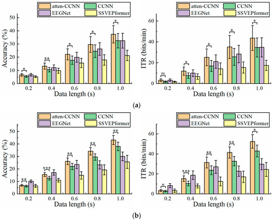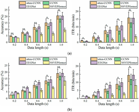 The accuracy and ITR on Dataset 1 with single-channel EEG under (a) subject-independent and (b) subject-dependent conditions. The error bars represent SEM, and the significance of the difference between atten-CCNN and CCNN is marked by ns (p ≥ 0.05), * (p < 0.05), ** (p < 0.01) or *** (p < 0.001).
