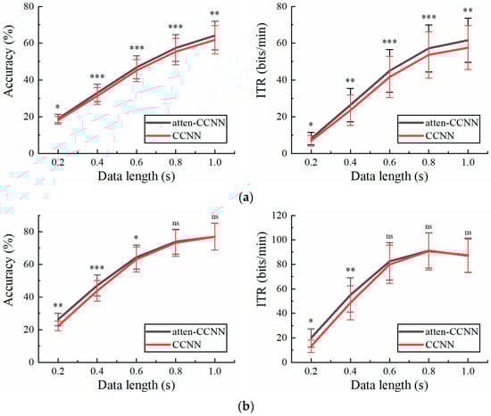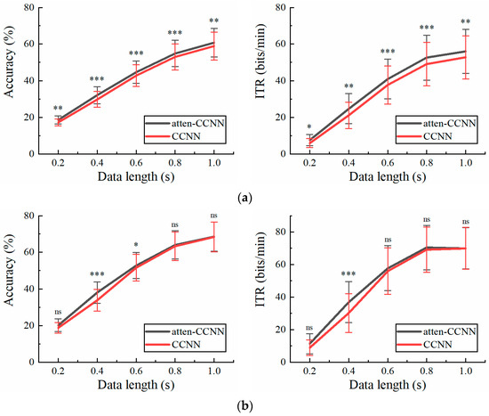 The accuracy improvement in atten-CCNN over CCNN on (a) Dataset 1 and (b) Dataset 2 when the data length was 0.4 s. The error bars represent SEM, and the significance of the difference between two models is marked by ns (p ≥ 0.05), * (p < 0.05), ** (p < 0.01) or *** (p < 0.001).