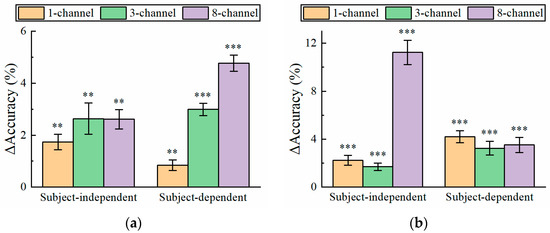 It can be found from Figure 3, Figure 4, Figure 5 and Figure 6 that for the short-time EEG signals, the improvement in atten-CCNN relative to CCNN was significant on both datasets, whether in the subject-independent or subject-dependent strategies. In order to further explore the relationship between the improvement in the proposed model and the number of EEG channels, the decoding results on a few-channel EEG were compared with that on eight-channel data because eight-channel EEGs are considered sufficient for multi-target SSVEP identification. Figure 7 shows the accuracy difference between atten-CCNN and CCNN when the data length was 0.4 s. Obviously, whether a single-channel, three-channel or eight-channel EEG was used for decoding, the accuracy improvement in atten-CCNN compared to CCNN was significant. According to Figure 7, the magnitude of the improvement in atten-CCNN did not appear to be strongly related to the number of EEG channels. There is no doubt that the algorithms were generally more effective as the number of channels increased. Nevertheless, the proposed model still maintained and even enlarges its advantage as the number of channels increased.