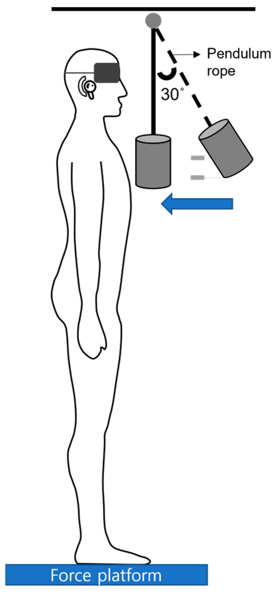 The experiment involved the participants standing barefoot on the force plate covered with four different surfaces, maintaining a natural foot distance while experiencing trunk perturbations. The perturbations were delivered using a pendulum attached to a cable suspended from the ceiling. The pendulum was positioned at a 30° angle from vertical, 0.6 m from the participant’s shoulder. A weight equivalent to 5% of the participant’s body mass was attached to the end of the pendulum and adjusted to hit the participant’s chest at shoulder level (Figure 1). For safety, a harness system loosely attached to the ceiling was used. A researcher released the pendulum following a “ready” signal, impacting the participant based on the pendulum’s motion principles, with a random 1–5 s delay to prevent predictability. The participants underwent familiarization with the pendulum perturbations twice before the experiment. Throughout the data collection sessions, the participants wore earphones to block environmental noise, which was primarily caused by the release of the pendulum, and blindfolds to block the view of the pendulum. The four support surfaces were applied randomly to the participants, and external perturbations were applied from the front to the back of the participants. The four support surfaces were applied randomly to the participants using a computer-generated sequence www.randomizer.org(accessed on 15 December 2023). Sealed envelopes containing the randomized sequences were prepared before the study and opened by a separate researcher at the start of each participant’s testing session. This procedure ensures transparency and prevents bias in the application of surface conditions. The researchers conducting the experiments and analyzing the data were blinded to the specific surface conditions being tested for each participant to further minimize potential bias. External perturbations were applied from the front to the back of the participants.