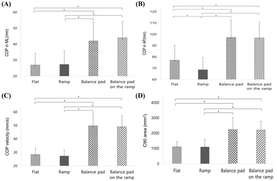 Results of the post hoc analysis comparing the COP displacement on different support surfaces (flat, incline ramp, balance pad, and balance pad on incline ramp) in response to external perturbations. (A) COP displacement in the ML (medio-lateral) direction. (B) COP displacement in the AP (antero-posterior) direction. (C) COP velocity in the ML direction. (D) COP area. Asterisks (*) indicate significant differences between support surface conditions (p < 0.05).