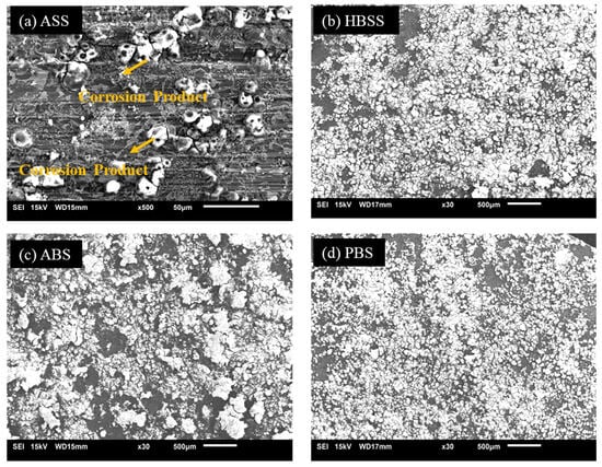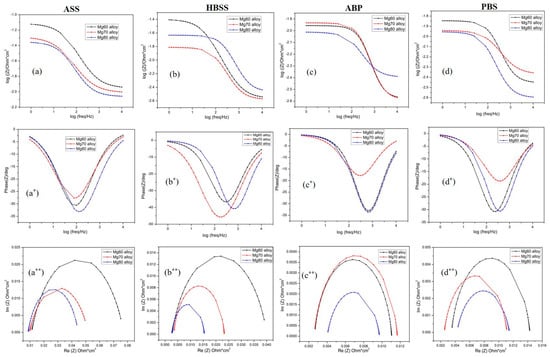 - Among all the three alloys, the Mg60 alloy exhibited low corrosion rates (~× 10−5 mm/year), with negligible surface defects observed on the alloy surface in all solutions. This can be attributed to the formation of Mg32(AlZn)49 and Mg–Zn–Cu phases and a lower Mg content, with a high atomic percentage of alloying elements. This stable nature contributes to excellent corrosion resistance;