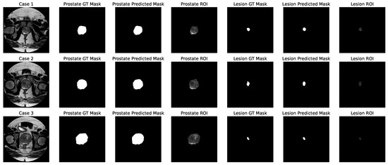 Figure 2 illustrates three cases, with each case displayed in a separate row. From left to right, the columns represent the entire scan, the prostate GT mask, the prostate predicted mask, the prostate ROI, the lesion GT mask, the lesion predicted mask, and the lesion ROI.