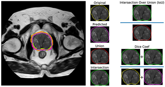 Figure 4. Visualization of the Dice coefficient and intersection over union metrics for segmentation. The color scheme for the contours is as follows: yellow for the original, purple for the prediction, red for the union, and green for the intersection.