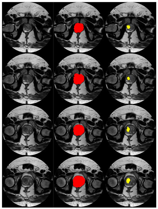 Figure 6. Images displaying visual samples of the segmented sections for a test case. The left column represents the scan, the middle column represents the prostate, and the right column represents the lesion. Each row represents a scan slice.