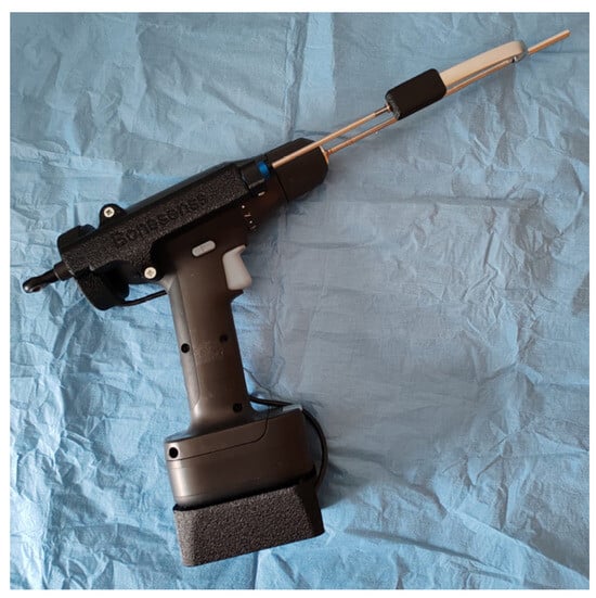 - Lang, S.D.; Gilmer, B.B. A Dual-Motor Drill Reduces Plunge, Simultaneously Gauges Depth, and Saves Time When Placing Orthopedic Screws. Orthopedics 2020, 43, e465–e470. [Google Scholar] [CrossRef]