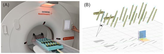 (A) CT scanning of the angle estimation experimental setup. (B) The obtained 3D model of the rods inserted into the holes to enable angle measurements.