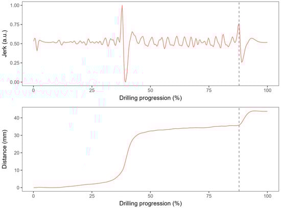 An example of a position signal recorded from the position sensor during drilling and processed in order to obtain the jerk. The vertical dashed line denotes the estimated moment of penetration of the second cortex.
