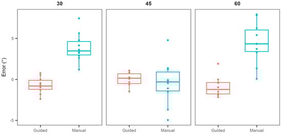 The mean absolute deviations ranged from 1.9 to 4.5 degrees for the manual approach, and from 0.6 to 1.3 degrees with the guided approach (Table 1). The p-values testing differences in mean absolute deviations for the 30-, 45- and 60-degree angles were 4 × 10−6, 0.60, and 5 × 10−5 (two-tailed two-sample Student’s t-test), respectively. To test for differences in precision, standard deviations were also compared, providing p-values of 0.11, 0.001, and 0.042 for the angles of 30, 45, and 60 degrees, respectively.