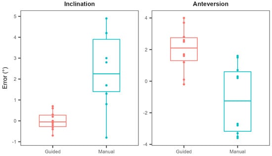 The angular accuracy and precision of the system were tested over a range of inclination angles or using an inclination–anteversion angle combination as a reference. The sensor-guided approach proved to be superior to the manual approach across all tested conditions, with a mean absolute error under 2 degrees.