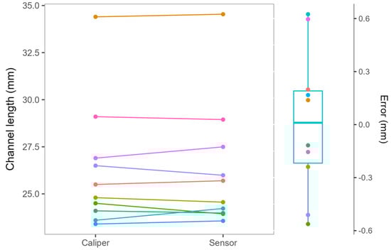 Channel length measurements obtained by analyzing the sensor data (Sensor label) and using a Vernier caliper (Caliper label). The obtained values are presented on the left, with corresponding measurements for each hole connected by a line. A boxplot on the right displays differences between the measurements obtained with the sensor and the caliper. The measurements for each hole were colored the same on both the boxplot and the line chart to facilitate comparison.