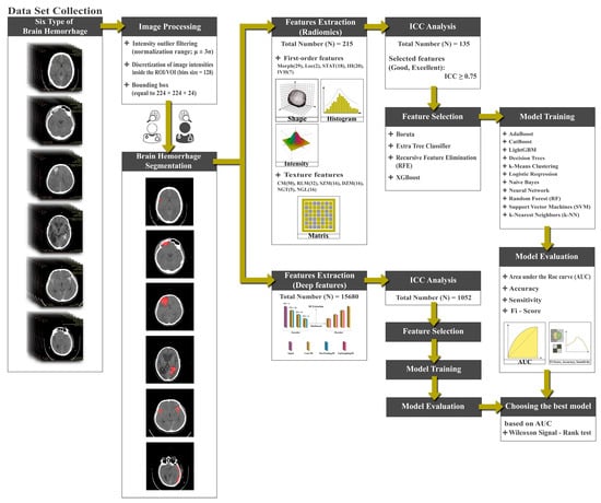 The reproducibility of the DFs and RFs was evaluated using the Intraclass Correlation Coefficient (ICC) with carefully selected parameters. These parameters included two-way random effects, absolute agreement, and multiple raters/measurements. The ICC is a widely used reliability index for measuring agreement between continuous variables in reproducible studies. It is a ratio ranging from 0 to 1. Based on the ICC value, reliability can be categorized as Poor (ICC < 0.5), Moderate (0.5 ≤ ICC < 0.75), Good (0.75 ≤ ICC < 0.9), or Excellent (ICC ≥ 0.9). Features with an ICC value of 0.75 or greater were considered for further analysis. To compute the ICC, an in-house-developed Python code was utilized. Additionally, Pearson’s Correlation Coefficient was employed to identify redundant features (correlation coefficient > 0.9). Hence, we computed the average of features with high reliability and non-redundancy for further analysis. Next, we utilized Boruta, Recursive Feature Elimination (RFE), and XGBoost techniques, along with the ExtraTreesClassifier, to identify the most relevant features. Subsequently, we employed 11 classifiers: AdaBoost, CatBoost, Decision Trees, K-Means Clustering, LightGBM, Logistic Regression, Naive Bayes, Neural Networks, Random Forest, Support Vector Machines (SVM), and k-Nearest Neighbors (k-NN) for the classification of Intracranial Hemorrhage. Next, we conducted hyperparameter optimization using a train–test split approach with a ratio of 70:30. The grid search technique was applied to explore the optimal hyperparameters on the training dataset. This process aims to fine-tune the model’s performance by systematically searching through a predefined hyperparameter space and identifying the combination that yields the best results. Subsequently, we executed 1000 bootstraps with a ratio of 0.9 on the test dataset. This comprehensive approach resulted in a total of 44 models for each of the six brain hemorrhage types, comprising four feature selection methods and eleven distinct machine learning models. The evaluation of these models was carried out using four well-established metrics, namely, Area Under the Curve (AUC), Accuracy (ACC), Sensitivity (SEN), and F1-score. The AUC values for all the models were subjected to a comparative analysis using the Wilcoxon signed-rank test, alongside the application of q-values to control for multiple testing. Multiple testing issues arise when conducting numerous statistical tests simultaneously, leading to an increased risk of obtaining false positives. To address this concern, we employed q-values as a robust tool in comparing different machine learning models. Q-values offer a controlled approach to the false discovery rate (FDR) and play a pivotal role in mitigating the impact of multiple comparisons. The method involves assigning a q-value to each observed p-value, representing the minimum FDR at which the corresponding test may be deemed significant. By utilizing q-values, we ensure a more stringent control over false positives, enabling a more accurate assessment of observed differences in model performance. This approach is particularly relevant in our study, where the comparison of machine learning models necessitates careful consideration of the potential for inflated significance levels due to multiple testing. A threshold of 0.05 was set to identify statistically significant results. The implementation of all the models and analyses was performed in R programming language version 4.0, utilizing the mlr library version 2.18 on the Ubuntu 18.04 operating system.