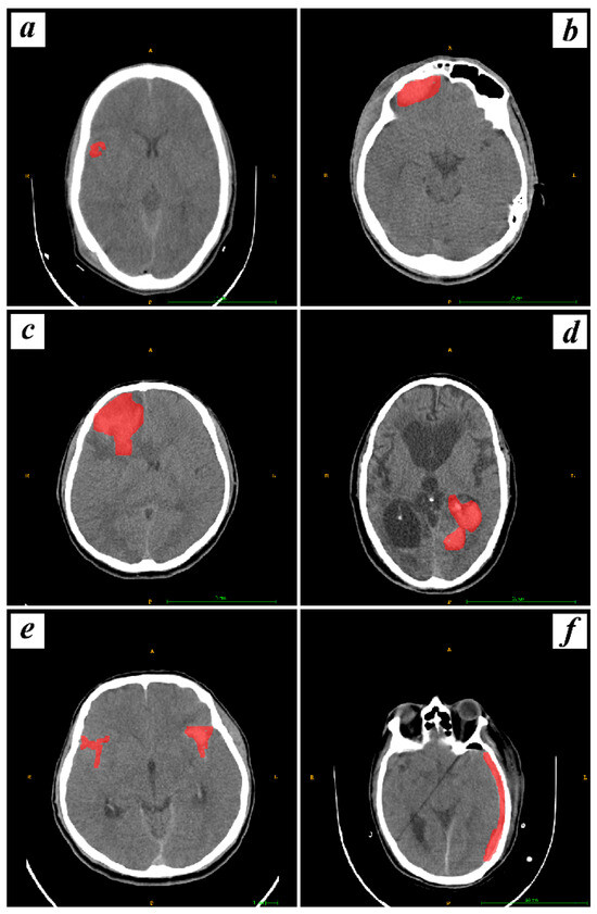 Visualization of manual segmentation for hemorrhagic types, including CC, EDH, IPH, IVH, SAH, and SDH, labeled as (a–f) respectively, with hemorrhages marked in red.