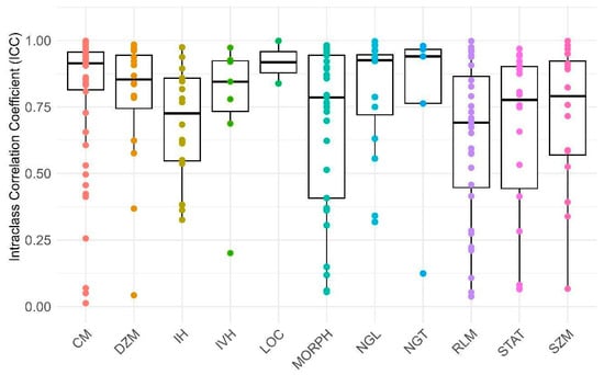 The Intraclass Correlation Coefficient (ICC) was first introduced by Fisher in 1954 as a modification of the Pearson Correlation Coefficient. Currently, the ICC is determined using mean squares, which estimate population variances based on the variability within a given set of measurements, derived from analysis of variance. ICC is widely employed in conservative care medicine to evaluate interrater, test–retest, and intrarater reliability. Ensuring the reproducibility of radiomics, particularly the robustness of its measurements, is crucial for its application in clinical practice and medical research. The ICC, a widely accepted measure in various scientific fields, including radiology and medical imaging, offers several compelling advantages that justify its adoption. Historically, the ICC has been a reliable measure for assessing the agreement and consistency of measurements [23,24]. Its use is well documented in radiomics, where precision and reliability are paramount. Moreover, ICC’s capacity to account for various sources of variability, such as those from diverse imaging protocols, equipment, and patient populations, makes it a robust tool for radiomics reproducibility assessment [24,25,26,27,28,29,30,31]. This aligns with the overarching goal of radiomics, which is to consistently and accurately derive quantitative information from medical images. Furthermore, ICC’s adaptability and versatility make it a valuable asset in radiomics research [25]. It transcends the constraints of measurement scales and data types, enabling its application to a wide range of radiomic features and datasets [26,28,30,31,32,33,34]. This adaptability is invaluable in handling the inherent diversity of radiomics data. Additionally, ICC produces interpretable results that facilitate meaningful comparisons and inference. Researchers and practitioners in the field are adept at interpreting ICC values, which allows for effective communication of the reliability of radiomics measurements. Overall, the ICC coefficient effectively reduces errors stemming from individual variability or the extraction methodology.