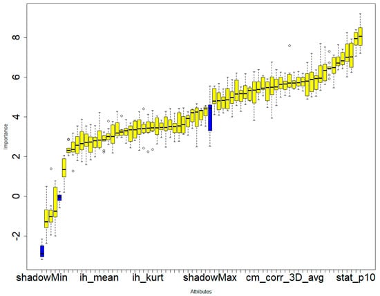 Boruta’s feature selection method illustrating the significance of various features in the differential diagnosis of six types of brain hemorrhages: SDH, EDH, CC, SAH, IPH, and IVH. The three blue boxes represent the minimal, average, and maximal importance of the shadow attributes.Only confirmed features for which the importance was significantly larger than that of the shadow variables were chosen as the final selected features for constructing the radiomics model. A total of 69 radiomics features were selected to construct the radiomics model.