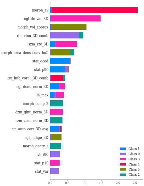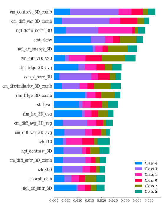 The importance of various features in the differential diagnosis of six types of brain hemorrhage, namely, SDH, EDH, CC, SAH, IPH, and IVH. In essence, this depiction showcases the scores that signify the utility and value of each individual feature during the creation of the boosted decision trees within the model. The ranking of features is determined based on their importance values concerning the differentiation of the six brain hemorrhage types. Notably, the figure presents the most crucial features selected through the utilization of SHAP (SHapley Additive exPlanations).