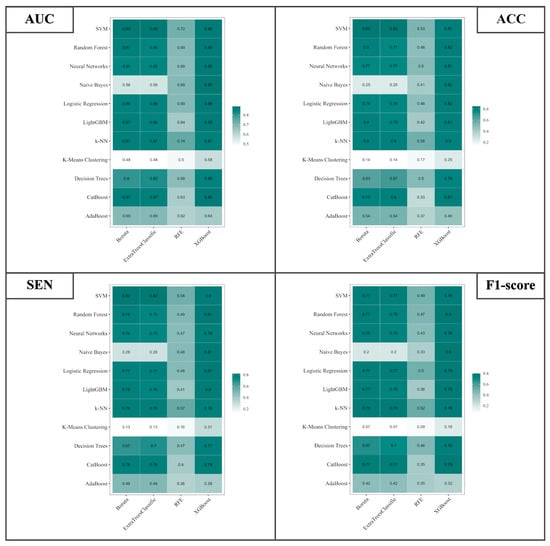 The current study delves into the critical domain of differential diagnosis encompassing SDH, EDH, CC, SAH, IPH, and IVH. The investigation entails a meticulous evaluation employing an ensemble of eleven classifiers coupled with four distinct feature selection methodologies. The metrics under scrutiny include the AUC, ACC, SEN, and F1-Score. The visual representations in Figure 10 encapsulate the overarching performance metrics. It is elucidated that the best-performing classifier–feature selection combinations are unveiled for each of the metrics. For AUC, the combination of SVM with Boruta feature selection and SVM with ExtraTreesClassifier achieved an AUC value of 0.89. Similarly, for ACC, SVM with Boruta and SVM with ExtraTreesClassifier reached an ACC of 0.85. The metric of SEN was maximized at 0.82, through the deployment of SVM with Boruta and SVM with ExtraTreesClassifier. However, for F1-Score, the combination of Random Forest + XGBoost and Naive Bayes + XGBoost achieved an F1-Score of 0.8. Moreover, the results encompass several noteworthy alternatives. Notably, for AUC, commendable outcomes were attained with SVM combined with XGBoost, Random Forest combined with XGBoost, Neural Networks combined with XGBoost, and Logistic Regression combined with XGBoost, all exhibiting an AUC of 0.88. The pivotal role of XGBoost in feature selection for AUC is evident from the results. In congruence, ACC exhibited promising results through Random Forest combined with XGBoost, Naive Bayes combined with XGBoost, and Logistic Regression combined with XGBoost, all registering an ACC of 0.82. Here again, XGBoost demonstrated its efficacy in feature selection. SEN values mirrored these trends, with Random Forest combined with XGBoost, Naive Bayes combined with XGBoost, and Logistic Regression combined with XGBoost yielding a sensitivity of 0.81. Subsequently, F1-Score indicated favorable outcomes through Logistic Regression combined with XGBoost, LightGBM combined with XGBoost, KNN combined with ExtraTreesClassifier, and KNN combined with Boruta, all culminating in an F1-Score of 0.79.