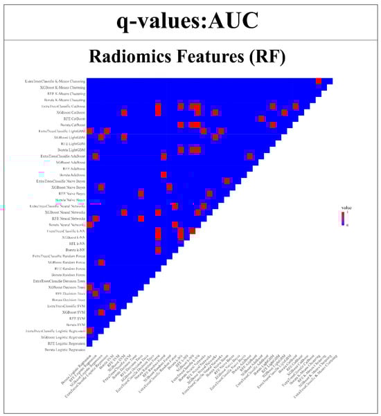 Wilcoxon signed-rank test is used to compare the AUC of RFs models compared with all other 43 models. (Q-value > 0.05 = red, q-value ≤ 0.05 = blue).
