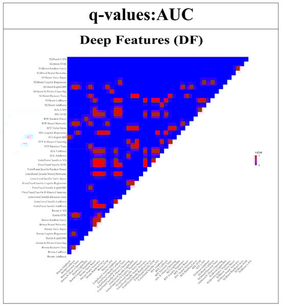 Wilcoxon signed-rank test is used to compare the AUC of DFs models compared with all other 43 models. (Q-value > 0.05 = red, q-value ≤ 0.05 = blue).
