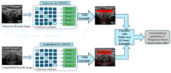 Thyroid nodules represent a prevalent form of endocrine malignancy, and ultrasound imaging serves as the primary screening method for their detection and assessment. However, the evaluation of thyroid nodule images poses considerable challenges due to the inherent complexity and variability in their appearance, making interpretation of the thyroid nodules highly subjective and reliant on the experience and expertise of radiologists []. Over the past few years, there has been a substantial increase in the number of studies focused on harnessing the capabilities of AI models for the assessment of thyroid nodule malignancy []. In the current study, we demonstrate that an ensemble of deep-learning models receiving transverse and longitudinal views of thyroid ultrasound B-mode images is more robust in detecting and characterizing thyroid nodules. By integrating the outputs of the ensembled YOLO models into an XGBoost model, we developed a sophisticated pipeline that combines deep learning for feature extraction with classical machine learning for final classification. Our study is among a few studies that integrate both transverse and longitudinal views of thyroid ultrasound images to enhance the accuracy of nodule classification. This dual-view approach leverages complementary information from different perspectives, which is not typically utilized in existing single-view methods. In addition, we compared the performance of our model with the ACR-TIRAD scores reported by an expert radiologist to demonstrate its potential capability for further engagement in clinical settings.