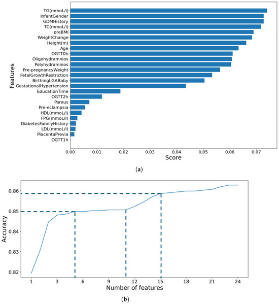 To illustrate the disadvantages of conventional automatic feature selection approaches in machine learning, which typically select the top k features based on a feature importance list, we use the Random Forest (RF) classifier to generate feature importance scores for the ManualFeature group, as shown in Figure 2a. We then run Algorithm 1 with the RF classifier, and the result is presented in Figure 2b. From Figure 2, it is evident that the top five features, from TG to preBMI, contribute approximately 85.0% to the RF’s performance accuracy. Despite having high importance scores, the next six features, from WeightChange to Polyhydramnios, do not significantly enhance the RF’s performance. This indicates that these features, generated by the RF classifier, are inappropriate for inclusion in the list. The subsequent four features, from Prepregnancy Weight to Gestational Hypertension, add approximately 1.0% () to the accuracy, and the remaining features contribute only about 0.4% to the accuracy.