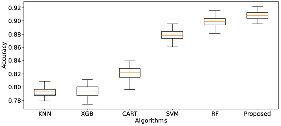 From Figure 4, the ranking of the five state-of-the-art algorithms in terms of mean accuracy is RF, SVM, CART, XGB, and KNN. To identify three classifiers and the weight metric W for our proposed classifier, we designate the primary classifier, either RF or SVM (RF is the best among ensemble tree algorithms—RF, CART, XGB—and SVM, ranked second, is a different type of algorithm). We then select two secondary classifiers from the remaining algorithms (RF/SVM (whichever differs from the primary classifier), CART, XGB, and KNN) by executing Algorithm 3. This algorithm allows us to determine the optimal classifiers, , and . The optimal parameters are as follows: the primary classifier is RF, the two secondary classifiers are XGB and SVM, and the parameter set . These parameters will be applied to other relevant algorithms for execution. The proposed solution is then implemented and compared to identify the most effective approach.