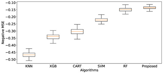 Furthermore, the negative MSE results are also presented in Figure 5. They show that the error rate for the proposed solution is the smallest MSE (synonym with the biggest negative MSE) and narrowest compared with other machine learning algorithms. Next, in order, are RF, SVM, CART, and XGB; the last is KNN. In other words, the proposed solution has a better prediction performance.