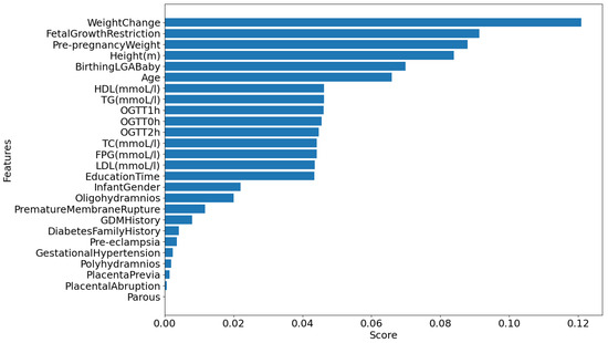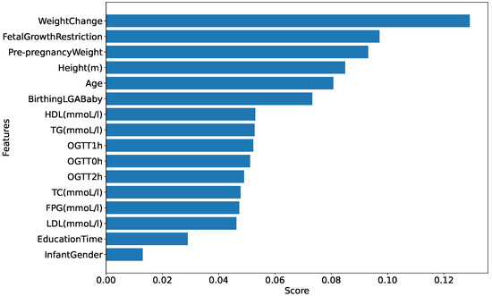 After identifying the best model (in this case, our proposed model), we executed Algorithm 1 using the ManualFeature group to determine the optimal feature group. Figure 6 presents the result of finding the best feature group by executing Algorithm 1 with the ManualFeature group and our proposed classifier. As explained in Section 3.1.3, the performance of our proposed classifier increases from the weight change feature to the infant gender feature, reaches a peak, and then stabilizes. This indicates that the classifier achieved its highest accuracy with 16 out of 24 features in the feature importance list (presented in Figure 7) generated by our proposed classifier. This optimal feature group, named the BestFeature group, consists of weight change, fetal growth restriction, prepregnancy weight, height, age, birthing LGA baby, HDL, TG, OGTT-1h, OGTT-0h, OGTT-2h, TC, FPG, LDL, education time, and infant gender.