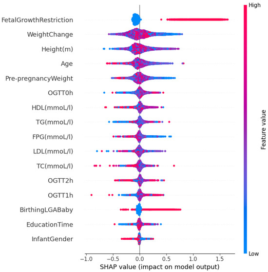 Figure 9 presents a beeswarm plot of feature importance for our BestFeature group based on SHAP values. This figure indicates that fetal growth restriction is a high-risk factor leading to SGA outcomes, while birthing LGA baby is more likely to result in LGA outcomes. Other features in the list also exhibit mixed and unclear effects on the classification of SGA, LGA, and AGA. Moreover, the order of feature importance in this figure differs from that in Figure 8, which is proved correctly as discussed in Section 4.2 above.
