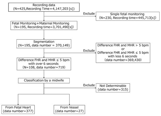 To create the AI dataset, the DUS signals were labeled by a midwife with clinical experience. To ensure efficiency and classification accuracy, we consulted with the midwife and conducted the process in four steps. Figure 1 in the paper illustrates the flowchart depicting the labeling process by midwives on the measurement data. In the first step, we extracted cases from the dataset where FHR and MHR were recorded simultaneously. We focused solely on simultaneous recordings because MHR was to be used as auxiliary data in subsequent processes. There were 195 such recordings, totaling 3,701,490 s. In the second step, data for the midwives to label were created, and the FHR, MHR, and DUS signals were divided every 10 s. The data segments were kept short to prevent mixing multiple categories and ensure they were of a length suitable for midwives to identify accurately. In total, 370,149 segments were created. In the third step, the data extracted in the second step were further selected based on the difference between the FHR and MHR. Segments where the difference was less than 5 bpm for at least 6 s were selected. This condition was adopted to efficiently obtain two categories of DUS signals, as the displayed FHR could be MHR [18]. This resulted in 719 segments within the 108 recordings. In the fourth step, the midwife categorized the DUS signals into “From Fetal heart”, “From Vessel”, and “Not determinable” by listening. The plotted DUS signal was also shown as an auxiliary to indicate the signal switching. The results showed that 377 segments were classified as “From Fetal Heart”, 27 segments as “From Vessel”, and 315 segments as “Not Determinable”. The “From Fetal Heart” category was extracted from 74 records, and the “From Vessel” category from 7 records. In four of these records, both the “From Fetal Heart” and “From Vessel” categories were obtained. Additionally, cases that included artifacts such as fetal movements, those with a mix of “From Fetal Heart” and “From Vessel”, and those where the amplitude of the DUS signals was too low to be audible were categorized as “Not Determinable”.