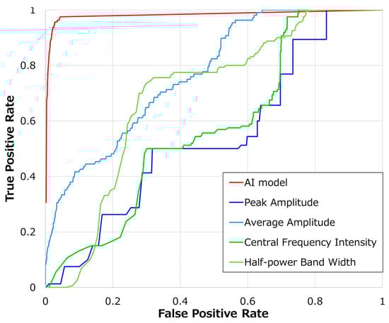 We evaluated whether the classification accuracy of the AI model was superior to that achieved through simple signal processing. To confirm this, the Receiver Operating Characteristic (ROC) curves were generated for each metric, and the Area Under the Curve (AUC) was computed. The ROC curve illustrates the diagnostic ability of a binary classifier system across various threshold settings, plotting the true-positive rate against the false-positive rate. The AUC serves as a measure of the overall performance of the classifier, with a higher AUC indicating better discrimination between positive and negative cases.