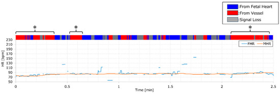 In contrast to signal loss, when the maternal heart rate (MHR) is incorrectly displayed as FHR, a significant delay can occur in taking appropriate action. This is because the displayed heart rate may maintain its continuity; if attention is not paid to the contamination of the MHR, the data will be recognized as of good quality [11]. Failure to differentiate MHR from FHR could result in missed opportunities for medical intervention, potentially impacting fetal outcomes [12].