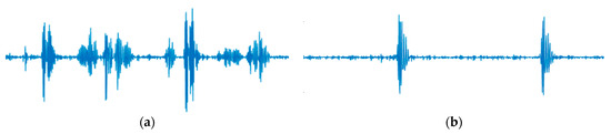 Examples of DUS signals are classified by the midwife. (a) Example of “From Fetal heart” (b) Example of “From vessel”. The signal lengths of (a,b) are both 1 s. Both examples record 2 beats.