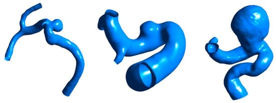 The geometric model of IAs is essential for measuring geometrical parameters and calculating hemodynamic parameters. Therefore, we first constructed patient-specific IAs geometric models based on clinical 3D Digital Subtraction Angiography (DSA) imaging data. The intracranial aneurysm imaging data were collected using the rotational DSA system (LCV; GE Medical Systems, Chicago, IL, USA) at Beijing Tiantan Hospital. The system performs a C-arm rotation before and after the injection of a contrast agent, acquiring a set of 44 3D images each time. The exposure rate was set at 8.8 frames per second, with each frame sized at 512 × 512, an inter-slice distance of 2.0 mm, a voxel size of 3.0 mm, and a DFOV of 2.10 cm. The GE workstation software (Advantage Unix; GE Medical Systems) compiled the acquired data into a DICOM (Digital Imaging and Communication in Medicine) format three-dimensional dataset, which was then imported into Mimics 13.0 (Belgium Materialize Company, Leuven, Belgium). Through level-set-based three-dimensional image segmentation and reconstruction, the vascular morphology of the intracranial aneurysm was modeled. Finally, it was converted to a 3D model of IAs in STL format, which was used as the original aneurysm vessel model for subsequent computational analysis. This study included 109 unruptured IAs and 40 ruptured IAs, yielding a total of 149 IAs 3D geometric models. The IAs 3D geometric models are shown in Figure 2. The raw imaging data for this study were provided by Beijing Tiantan Hospital, affiliated with Capital Medical University. All patients provided informed consent, and this protocol was approved by the hospital’s ethics committee.
